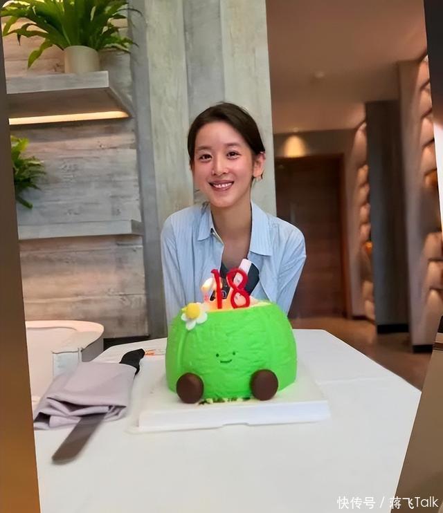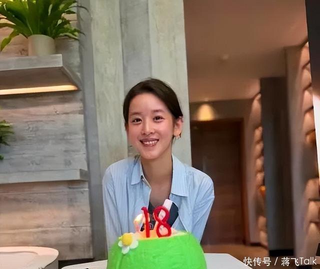 当天章女士穿了一件蓝色条纹衬衣,将头发扎在脑后,脸上看起来并没有化妆,素颜也太美了,这皮肤状态根本看不出已经32岁了。 从章女士的穿着打扮来看,应该是在家里庆祝,房子内部装修的还真挺气派,桌子上只摆了一个绿色的可爱小蛋糕,