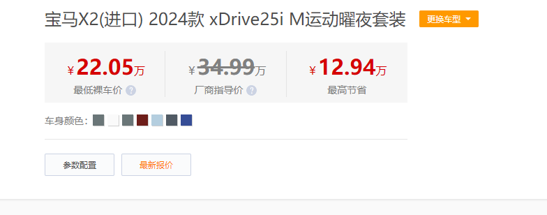 近期车市降价潮中信通实盘,进口宝马X2抛出重磅福利——最高优惠达12.94万,部分车型入手价下探至20万级区间,让消费者直呼“真香”,却让不少老车主直呼“破防”。